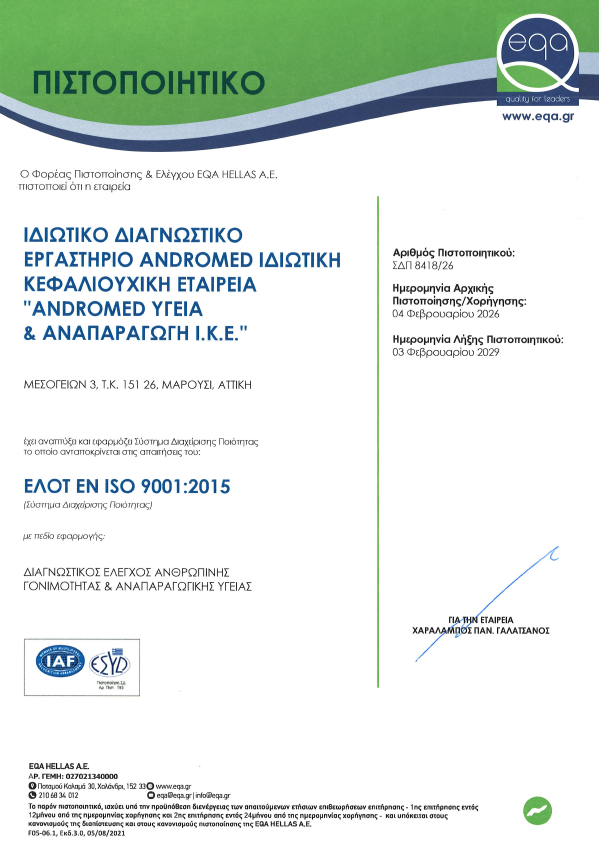 At Andromed and Femina by Andromed, reliability and scientific validity are at the core of our operations. We are proud to announce the official certification of our Diagnostic Center according to the international quality management standard ISO 9001:2015 by the accredited body EQA Hellas.